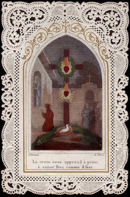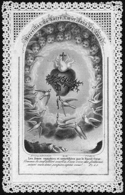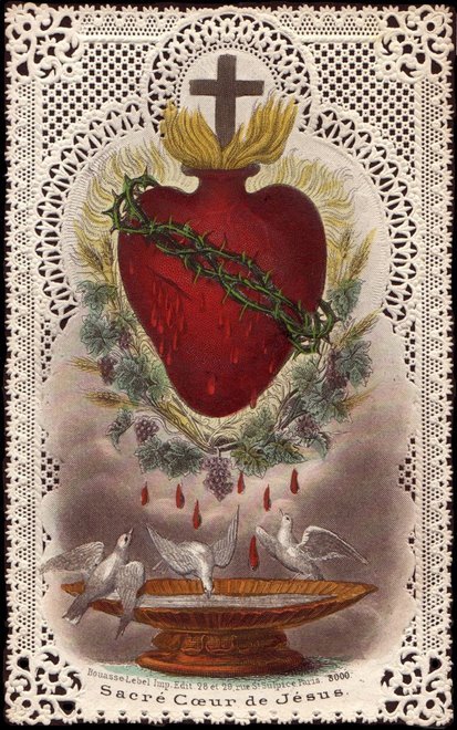 While Dove Cote of Our Lady gathers example of images in which the Mother of God is shown guiding the soul to Christ, in this section I will be gathering examples of images in which the dove is a symbol for the soul's personal and intimate relationship with Christ himself. Contemplation, adoration, prayer, appreciation for the Eucharist, and above all friendship with the Savior deepen was we see His love depicted through the metaphor of the dove. The artists were true to Scripture, making use of ways Our Lord revealed himself by word and example, but you have to allow for the freshness of metaphor. The Good Shepherd, for example, was reinterpreted as the Divine Bird Keeper. This image, entitled Le Divin Abri, can be translated as The Divine Shelter, and it can also literally be translated as The Divine Nest. By inference the Church of Christ is described metaphorically as the Divine Bird Sanctuary, the place where the soul is safe. It is showing us a state of being; it is describing the sanctuary or the safety that is assured by a life lived in relationship to Christ, and at the same time it is showing us Jesus, the Lord of Life, eternally at work: "I will be with you always" we seem to hear again as we see Him hovering, like a bird with young in the nest, nurturing the soul and preparing it for the strength and lightness it will need to reach its ultimate freedom: the state of Divine Union.